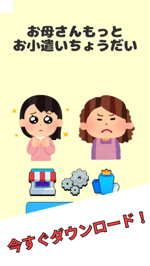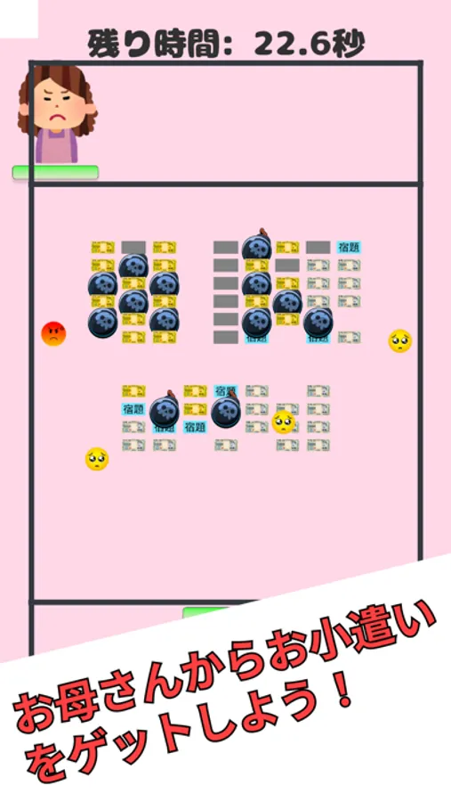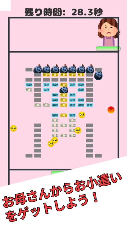 このゲームはただのブロックくずしではありません。プレイヤー(娘)と敵(お母さん)が熱い戦いを繰り広げます。シンプルな操作で、ブロックを崩してお金をゲットしましょう!