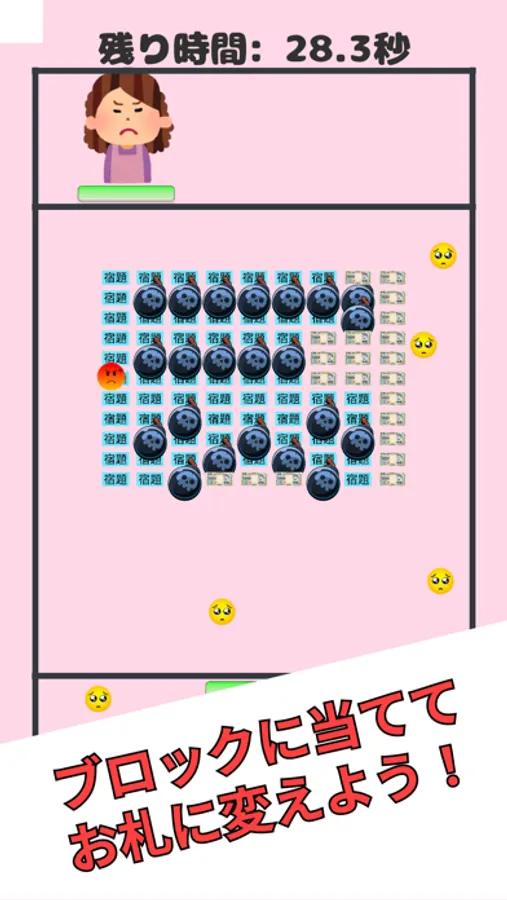 お母さんが放ったボールがお金のブロックに当たると、お金のブロックを宿題のブロックに変えます。