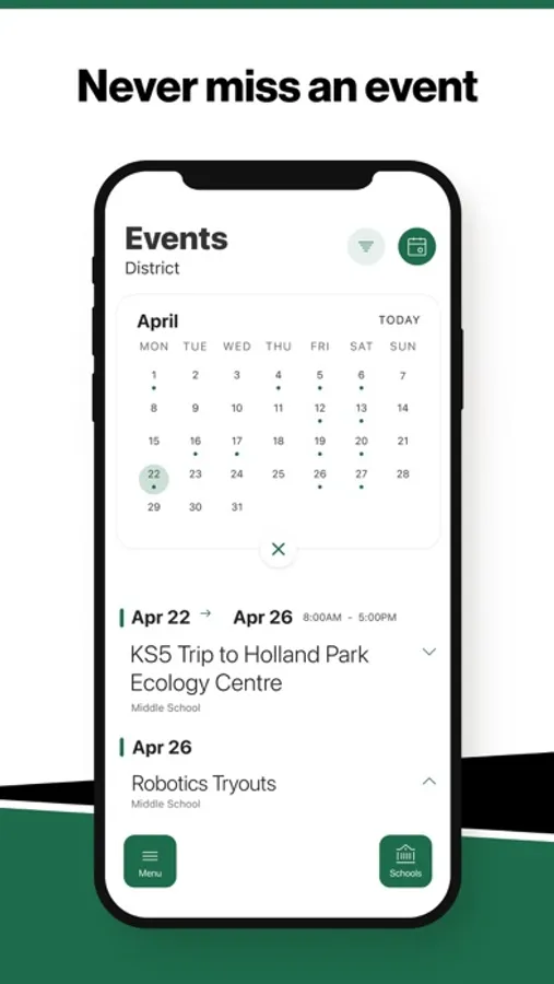 The event section shows a list of events throughout the district. Users can add an event to their calendar to share the event with friends and family with one tap.
