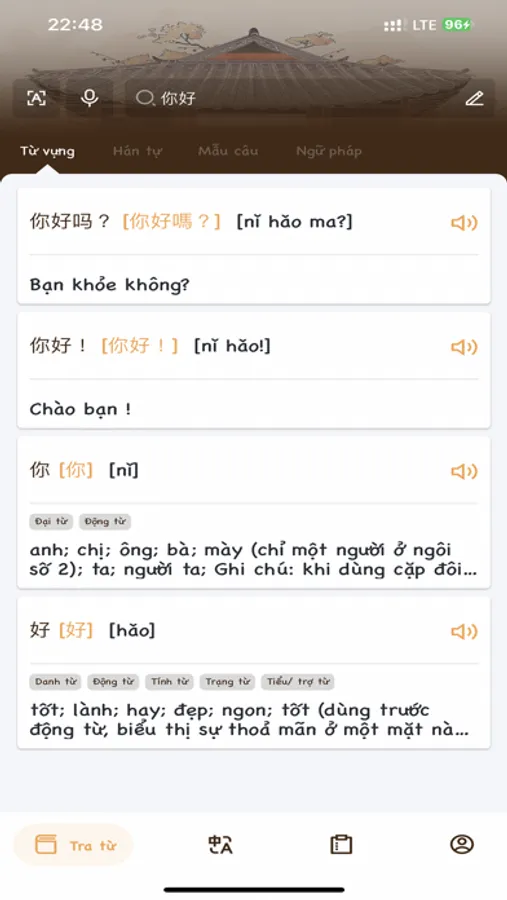 Tra Cứu Nhanh Chóng: Tìm kiếm từ vựng và câu trực tiếp từ bất kỳ vị trí nào trong ứng dụng.