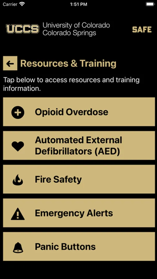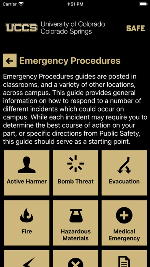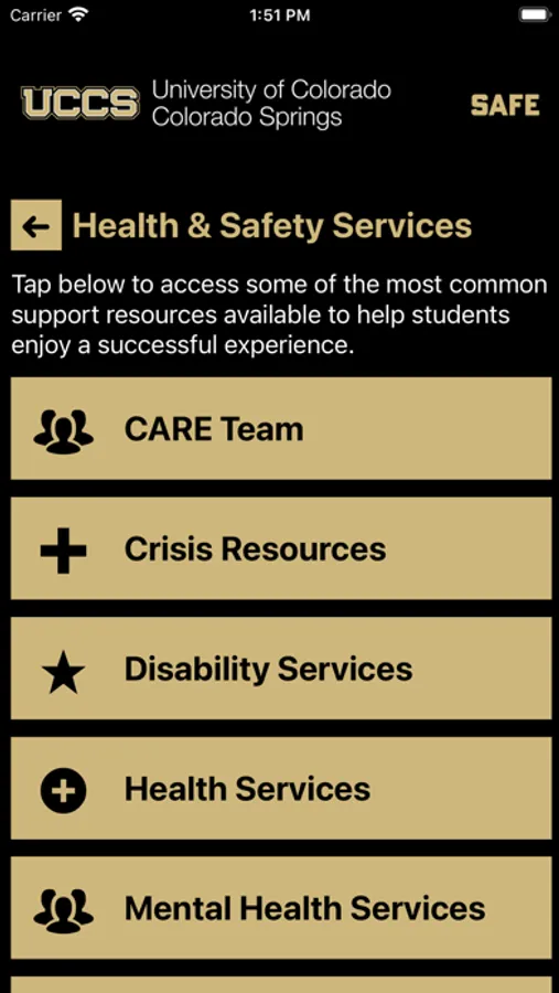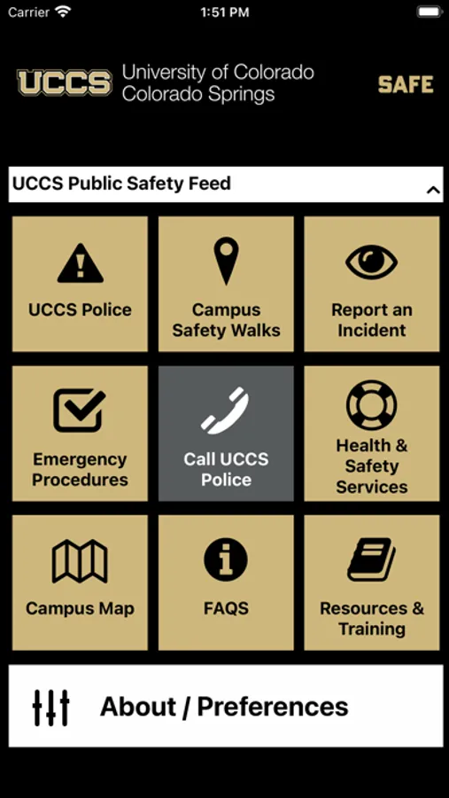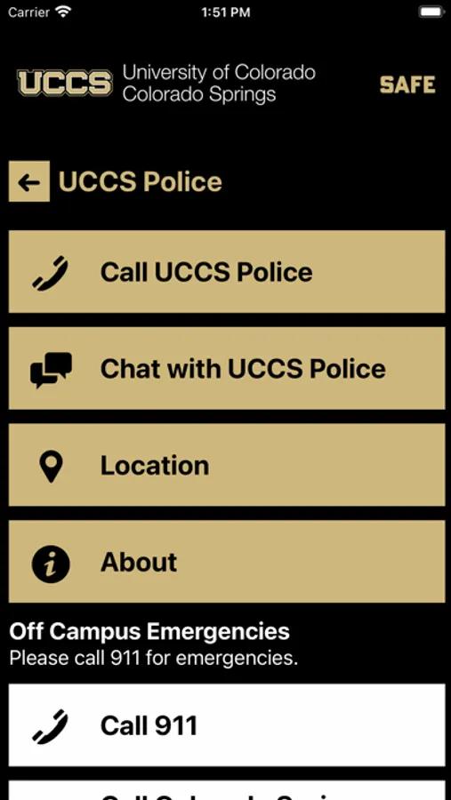 UCCS SAFE is the official safety app of University of Colorado - Colorado Springs. It is the only app that integrates with University of Colorado - Colorado Springs's safety and security systems. UCCS Police has worked to develop a unique app that provides students, faculty and staff with added safety on the University of Colorado - Colorado Springs campus. The app will send you important safety alerts and provide instant access to campus safety resources.