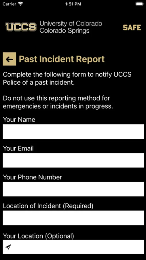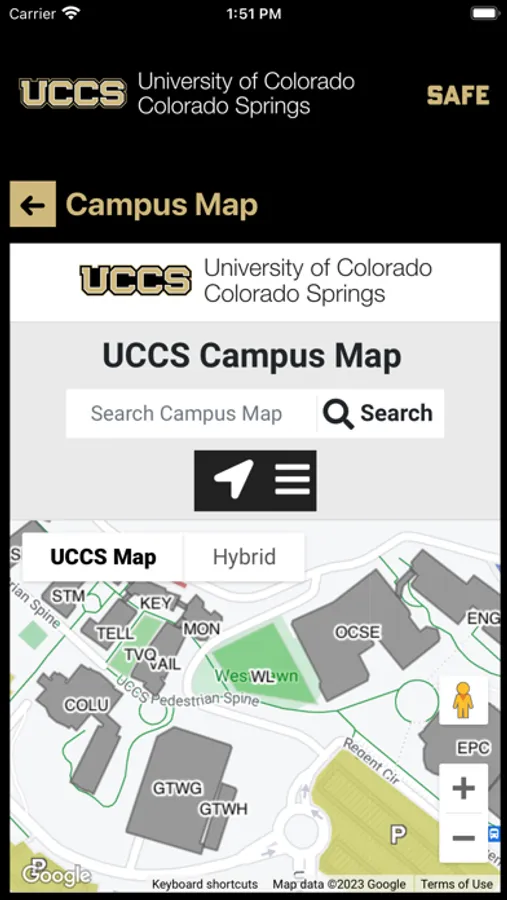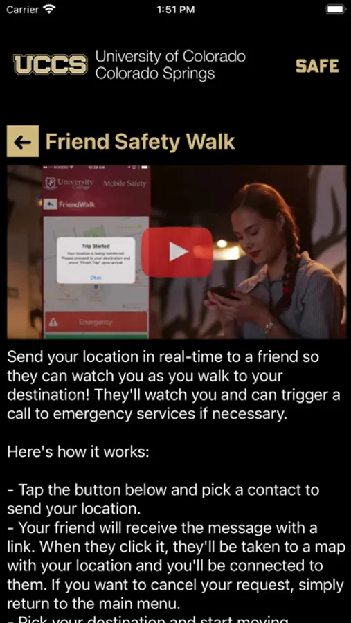 - Virtual Safety Walk: Allow UCCS Police to monitor a user’s walk. If a user feels unsafe when walking on campus, they can request a Virtual Safety Walk and a dispatcher on the other end will monitor their journey until they reach their destination.