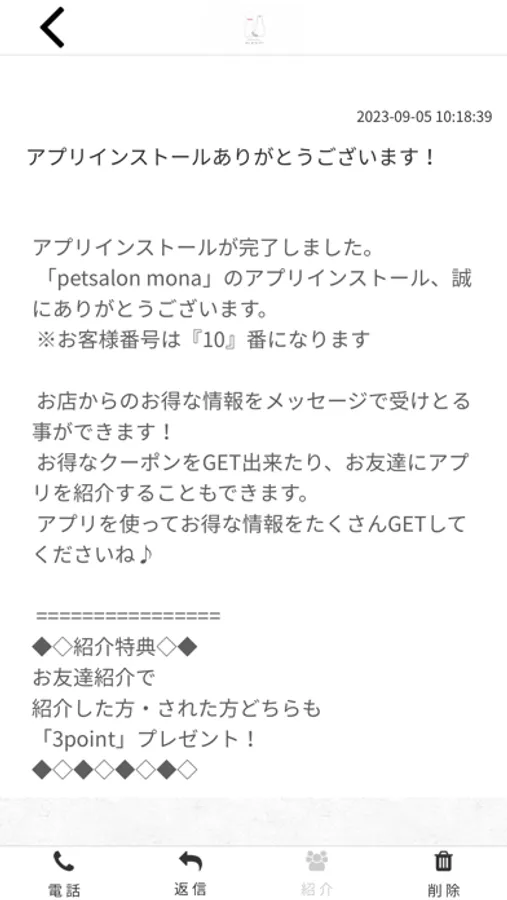 petsalonmonaのアプリをSNSを通じてお友達に紹介する事ができます。
