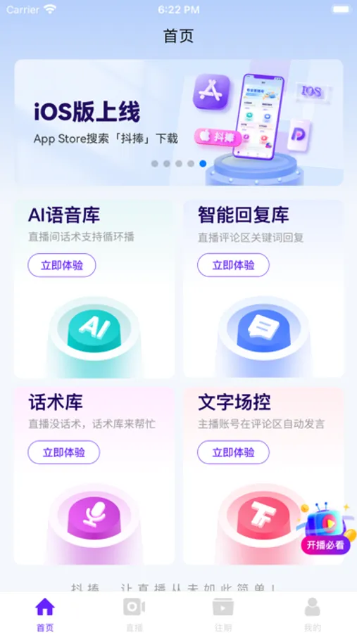 AI语音库、智能回复、直播管理、关键词收录、违禁词监测、录音功能、新手教程、往期入口、开播必看等功能