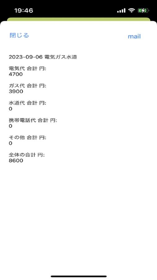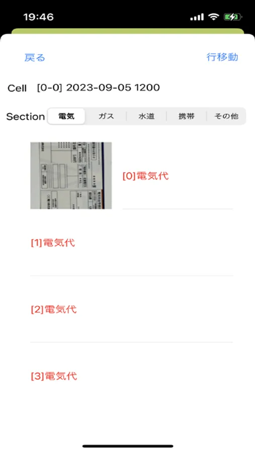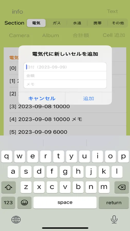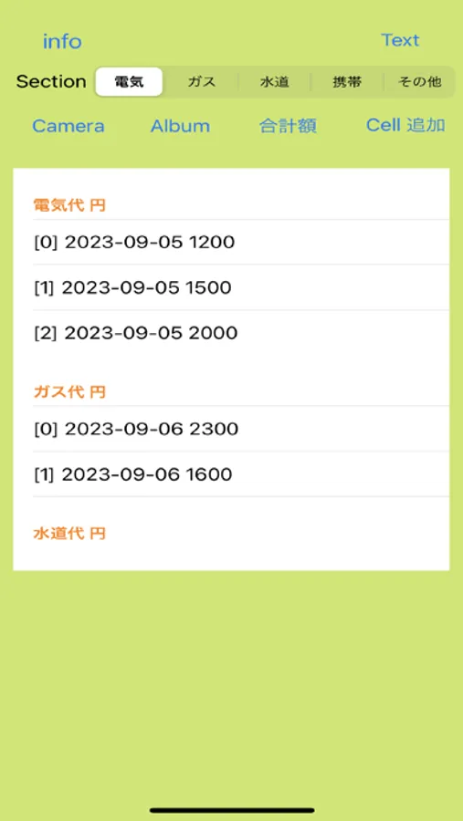 このアプリは、電気代・ガス代・水道代・携帯電話代・その他の5セクションからなる日付(支払日・振替日等)つき光熱費等管理プログラムです。セクションはセグメントで指定し[cell 追加]ボタンで追加します。画像については各セクション4枚ずつ合計20枚まで登録・表示することができます。[Album][Camera]ボタンを押した後セルをタップしてアルバムやカメラを起動して画像を追加してください(例えば、電気ガス水道等の検針票「使用量のお知らせ」を撮影し、差替え=上書きも可能)。追加したセルを押すとセルの内容(数値等)と画像を表示できます。また、セクションをセグメントで指定して[行移動]ボタンを押すことでスクロール移動します。追加したセル(文字列)は行を横方向にスラップすることで削除できます。また、[Album][Camera]ボタンを押した後、画像についても行をスラップしたり[全削除]ボタンを押して削除することができます。さらに、[Text]や[合計額]ボタンを押してセルの内容(合計額を含む)をテキスト出力することができ、メール送信も可能です。(v1.0 2023.9.10)