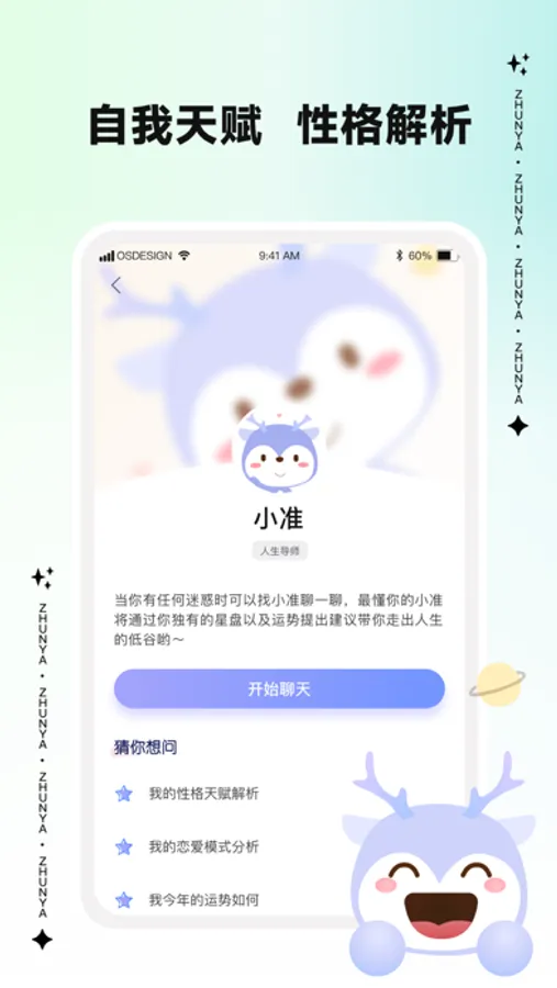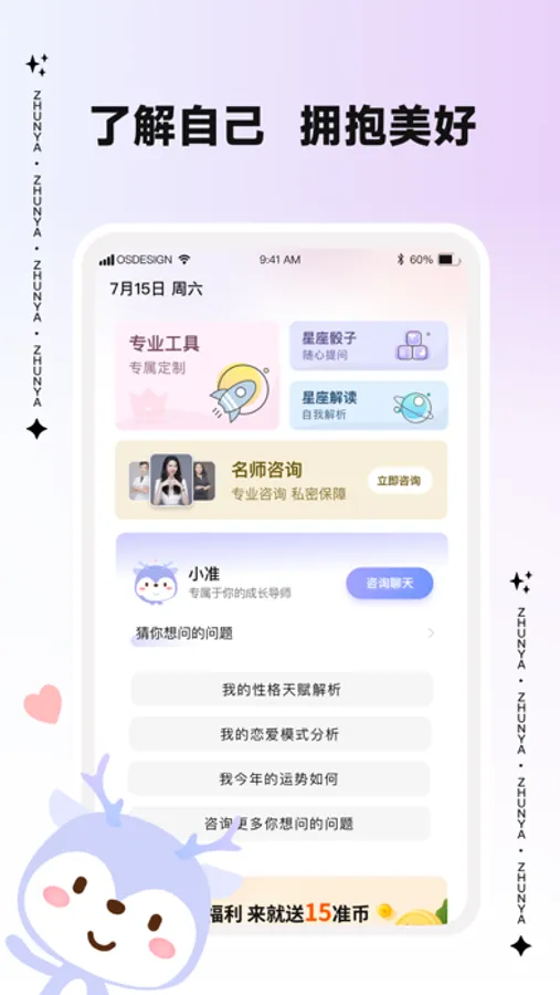 准呀是一个星座工具内容与情感咨询于一体的兴趣类软件,汇集了情感咨询、问题解答、星座工具等基础功能,致力于打造一个专业、高效、有趣的全新情感类平台。