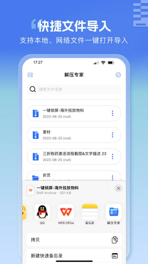 【快捷文件导入】 支持本地、网络文件一键打开导入。支持从其他应用,如微信、QQ、邮箱、隔空投送等方式分享文件到解压专家。