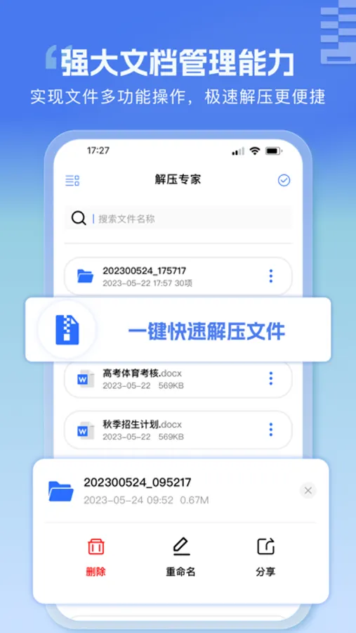 支持新建文件夹、重命名、移动、删除文件夹等个性化操作。还能选择多个文档,批量解压,一键搞定。压缩解压的文件在软件内可实现一键分享操作,学习办公效率更高,完全不用电脑在身边,手机就能处理。