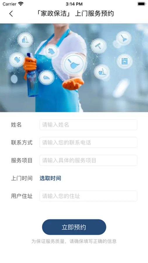 这是一款家政服务预约在线预约app,用户可以在线提交申请,等待专人联系