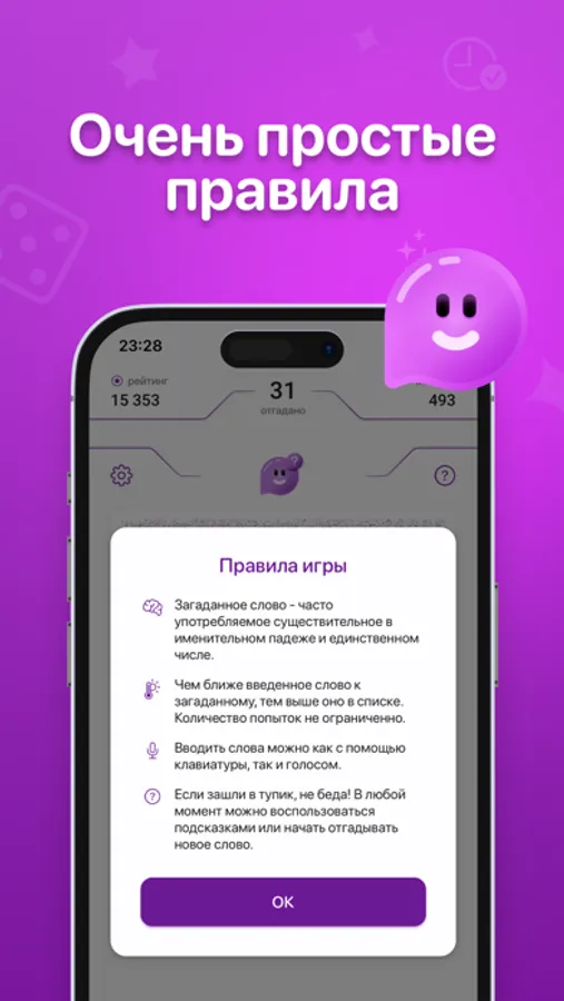 Правила игры просты: загаданное слово - это существительное в именительном падеже и единственном числе. Чем ближе введенное слово к загаданному, тем выше оно в списке. Вводить слова можно как с помощью клавиатуры, так и голосом.