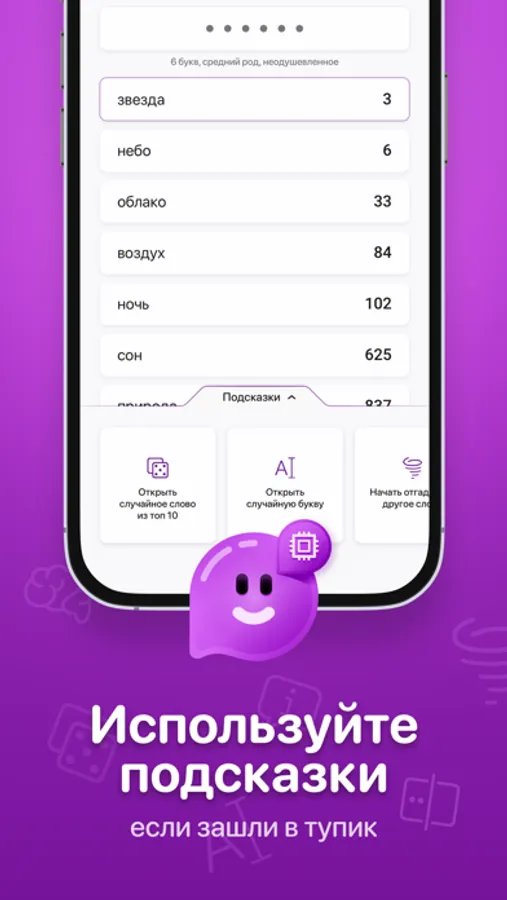 В любой момент можно воспользоваться подсказками или начать отгадывать новое слово.