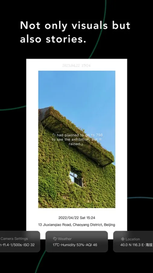 · Automatically records the time, location, weather, and other environmental information during the shoot, making a story attached to the images and videos.