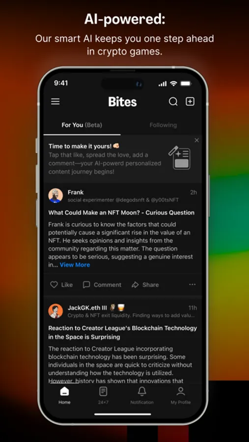 Be ahead of the curve, not just on the curve! Bites is your must-have app for staying on the cutting edge of the cryptocurrency world. Imagine being the first to catch the wave of the latest trends and updates, effortlessly. Whether you're a seasoned crypto pro or just getting started, winning in this field is all about staying informed, and Bites is your secret weapon with: