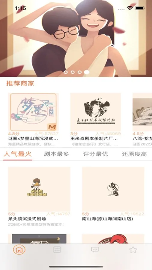 这是一款可以查看关于剧本杀桌游的生活软件,在上面你可以便捷的查看各种店铺的信息,挑选你最喜欢的店铺和剧本,周末和朋友一起去剧本店铺玩游戏,里面还可以进行各种技术的交流,快来体验吧~~