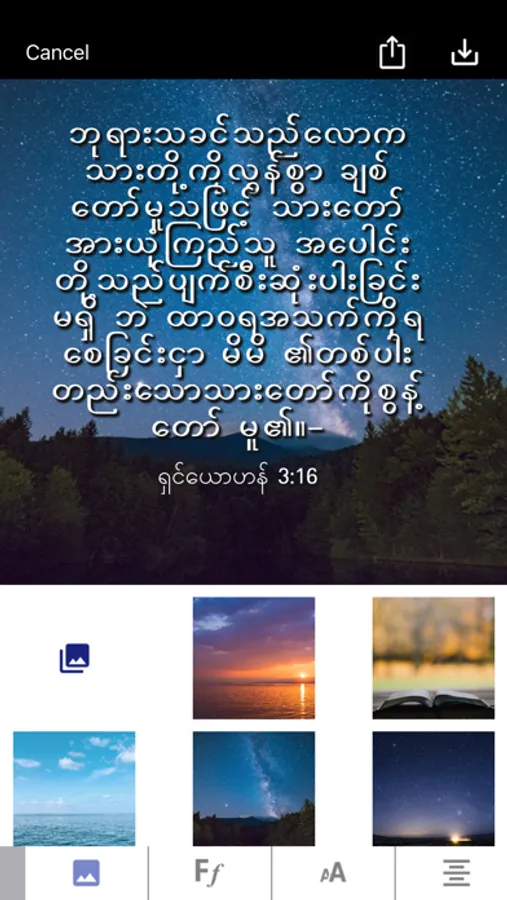 • When you tap on a verse, an image button is shown on the bottom toolbar. When this button is pressed, the 'Edit image' screen appears. You can choose the background image, move the text around the image, change the font, text size, alignment, format and color. The finished image can be saved to the device and shared with others.