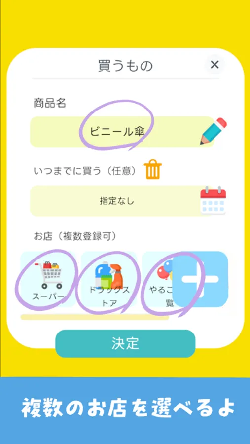 詳細設定: 物品に対して、カテゴリ、購入期限、お店(複数可)を設定可能。