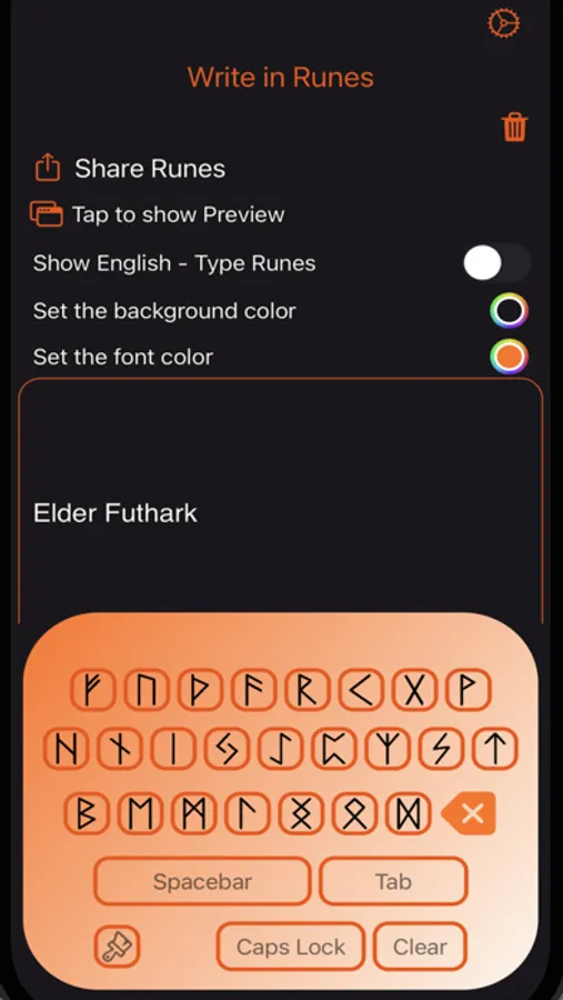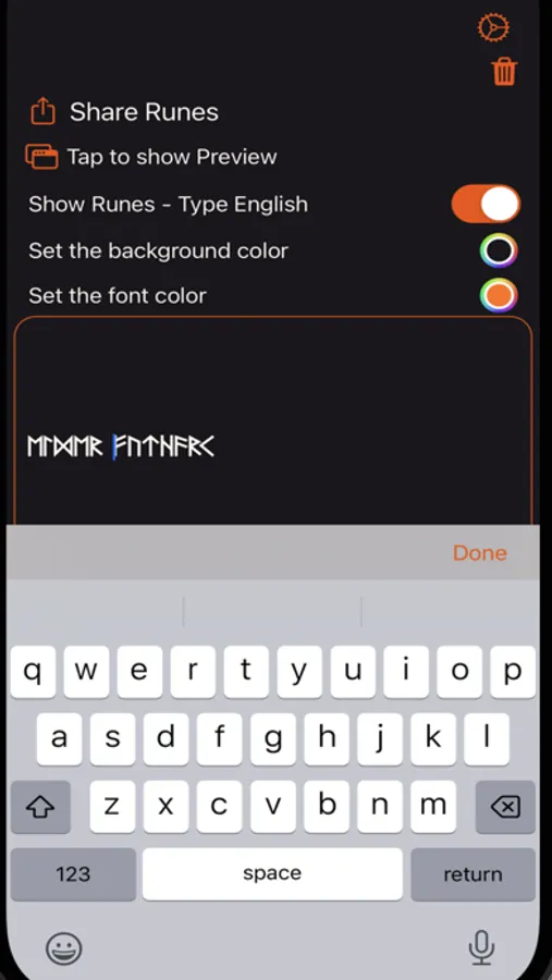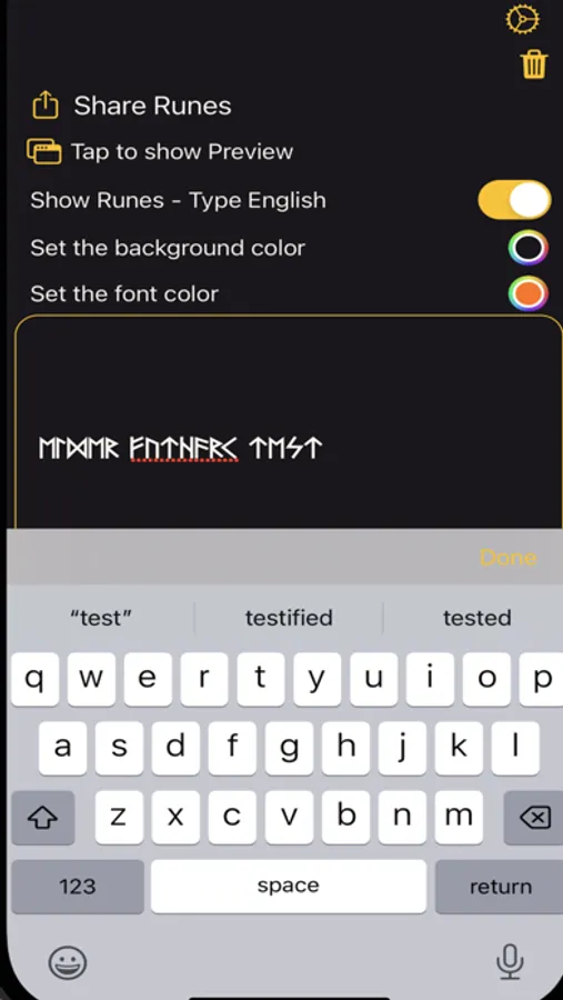 Rune Translator is a tool that allows you to write in English and translate into Runes. You can also write in Runes with our custom runes keyboard and translate the text to English. Please keep in mind that the alphabet to runes is not a one to one relationship. This tool also allows you to social share and also save what you type as an image on your device. You can also customize the background colors and font colors.