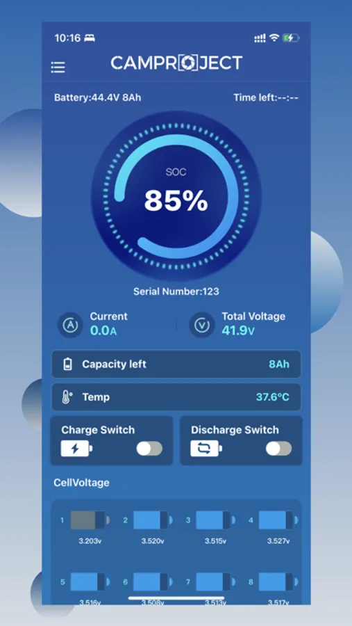 2) Displays detailed battery information on the Main page : State of Charge Percentage, Voltage, Current, Temperature, Capacity left, Cell Voltage and so on.