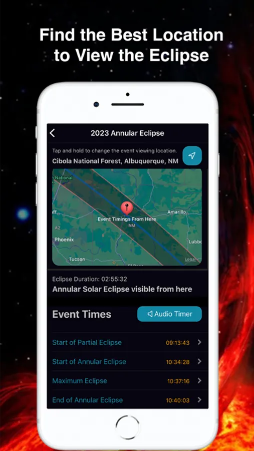 + Interactive Eclipse Map: Find your ideal eclipse-watching spot on the map, and receive precise eclipse event times for any location on Earth. Your journey to the perfect vantage point begins here.