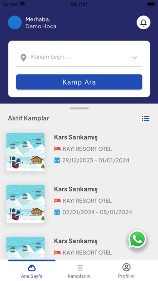 Bu uygulama, ebeveynlerin kendilerinin ve çocuklarının katılacağı kayak kamplarının bulunduğu ve bu kampları düzenleyenlerle iletişime geçebileceği bir ortam sunuyor.
