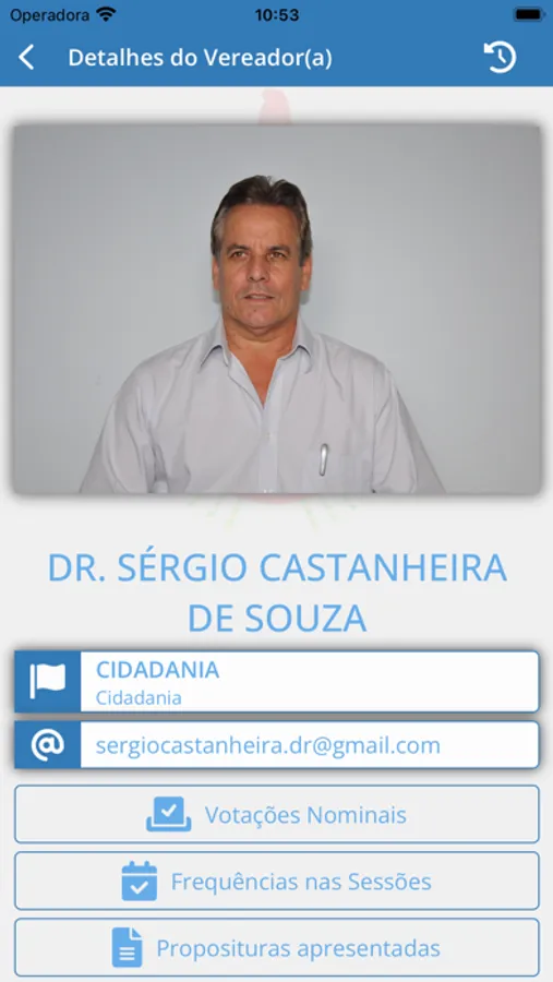 • Consulta a listagem dos Vereadores em exercício, exibindo o nome, partido, e-mail, telefone, links para proposituras apresentadas, frequência nas sessões e votos nominais;