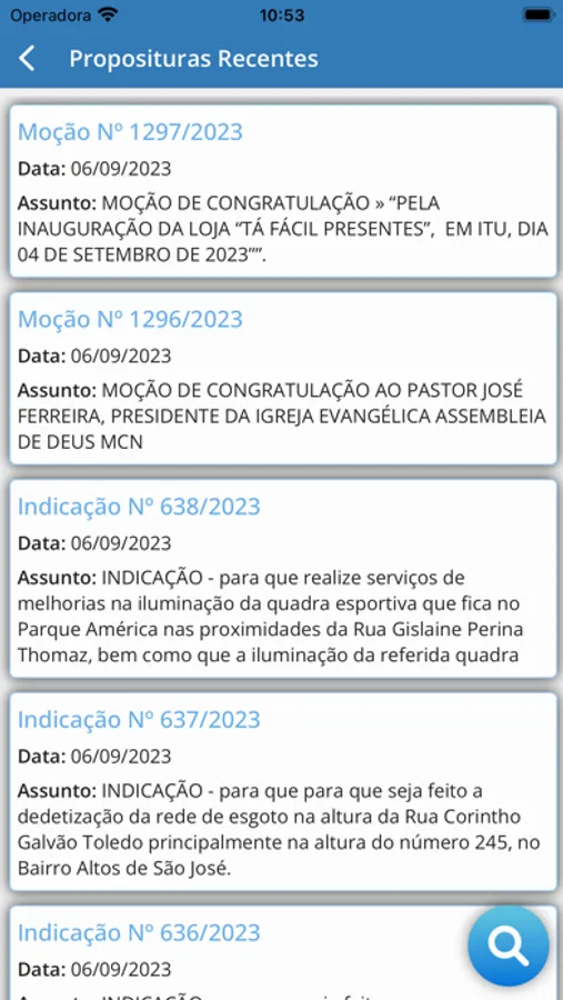 • Consulta de Proposituras por palavra, número, período de apresentação e situação do documento.