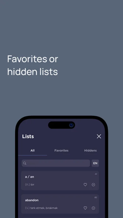 You can find Turkish meanings and example sentences of these vocabularies, which are very important for improving English grammar and communication skills, in this application.