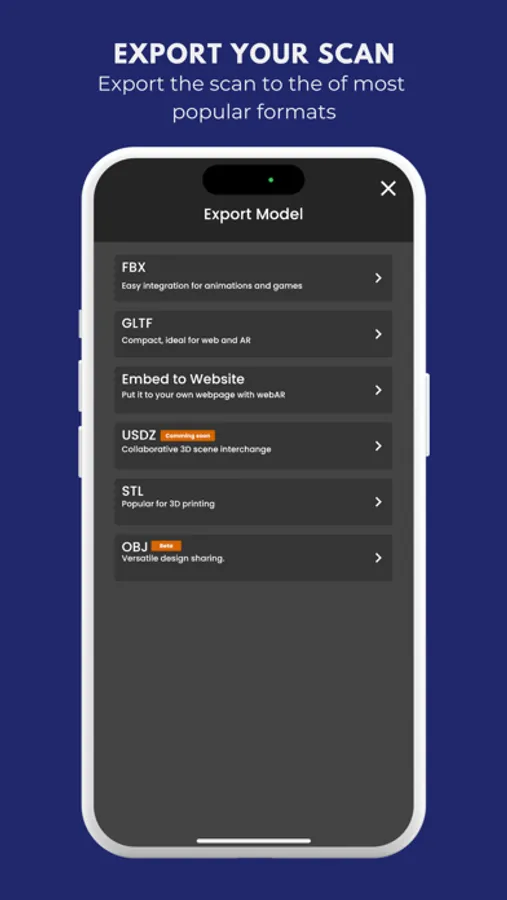 View your scans in AR or edit right in the app. Take measurements, customize your models, and export in popular 3D formats like glTF, FBX, STL, OBJ, USDZ and ply. Share via Messages, your website, or social media.
