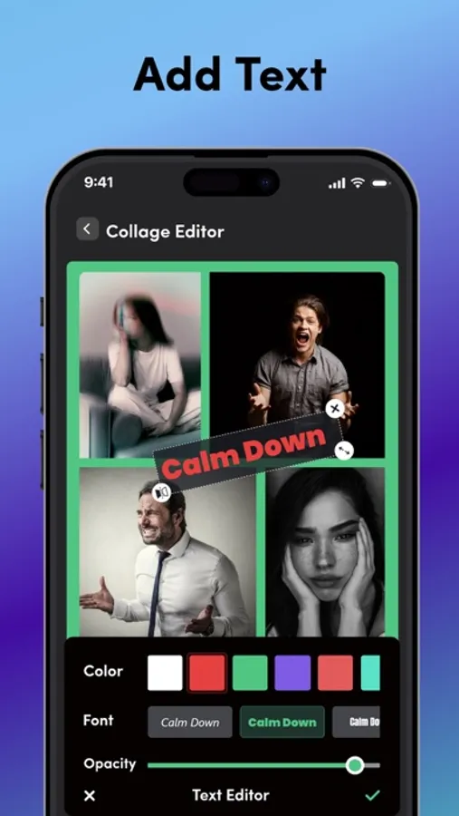 You can add photos and use text in the photo grid. We offer various fonts to add to individual photos or the complete grid. From handwritten fonts to formal ones, there is something special for everyone. Other than the font styles, you can use our editing options to change the size colors and play with the font as you like.