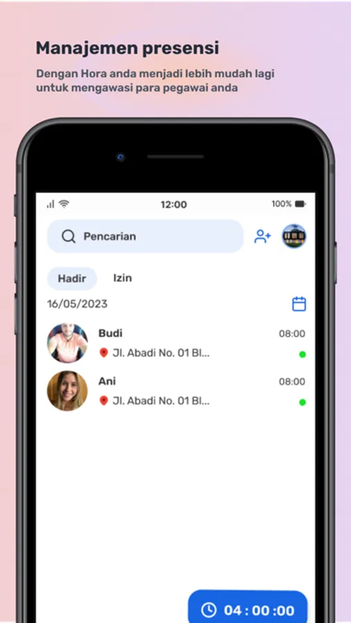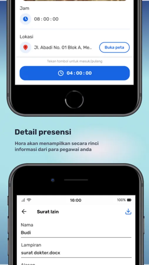 Unduh Pengelola Presensi Digital Hora sekarang dan ambil kendali atas kehadiran profesional Anda seperti belum pernah terjadi sebelumnya!