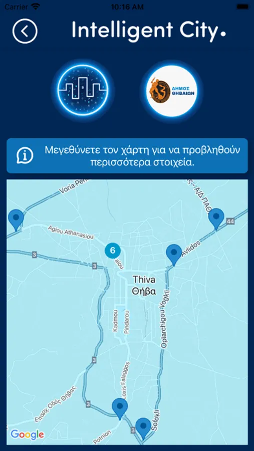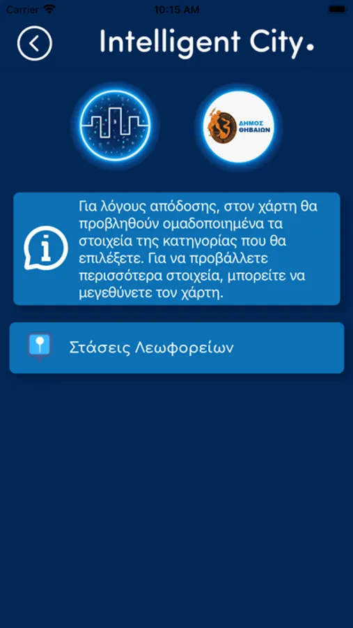 Επίσης παρέχεται η δυνατότητα προβολής των στάσεων λεωφορείων του Δήμου Θηβαίων, με την χρήση της πλατφόρμας CityPoints του Intelligent City.