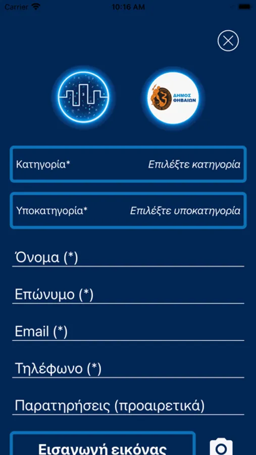 εφαρμογή δίνει τη δυνατότητα επιλογής κατηγορίας βλάβης (απορρίμματα,