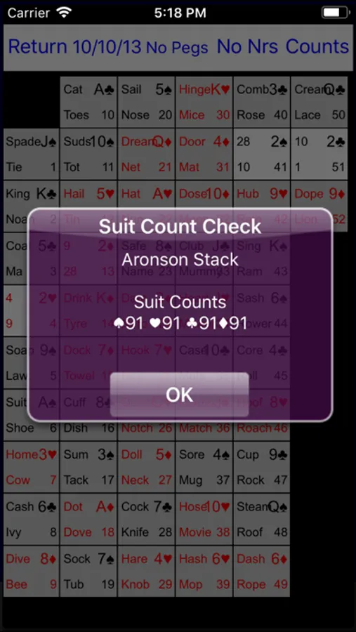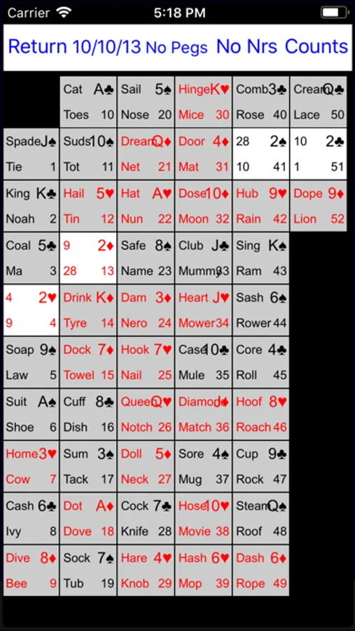 - Lorrayne's peg words for the 52 cards and 52 positions, plus 3 user defined sets