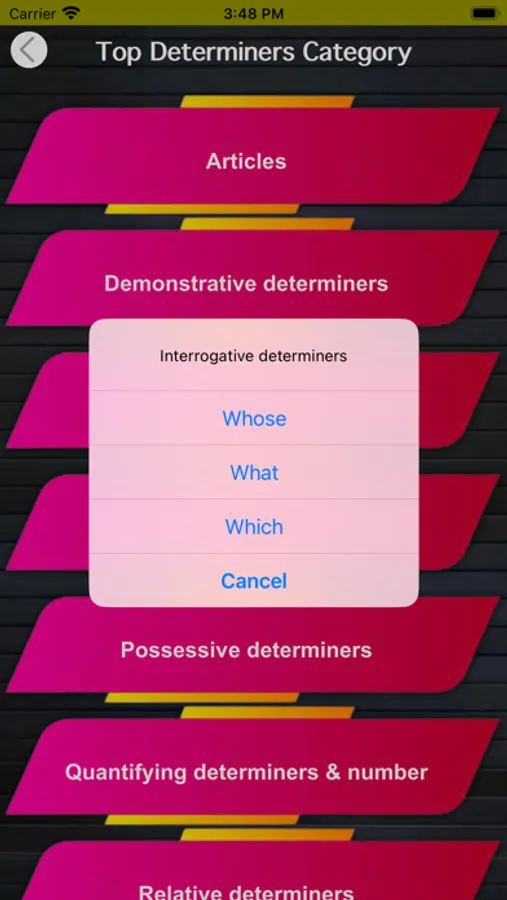 On tap of any determiner, user will get to learn the determiner in detail with usage.