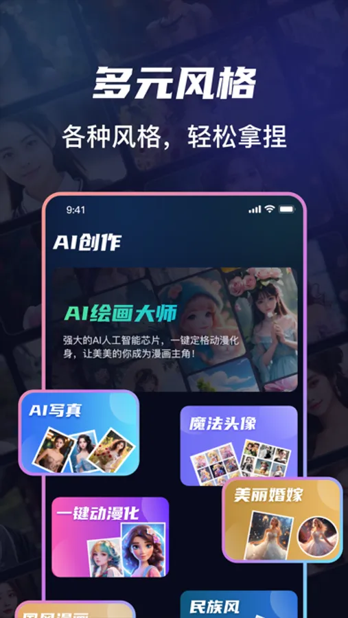 【风格多样】不管是3D风,朋克风,小清新风,水墨风,油画风,卡通风,水彩风等等这里应有尽有,满足你的不通过需求。