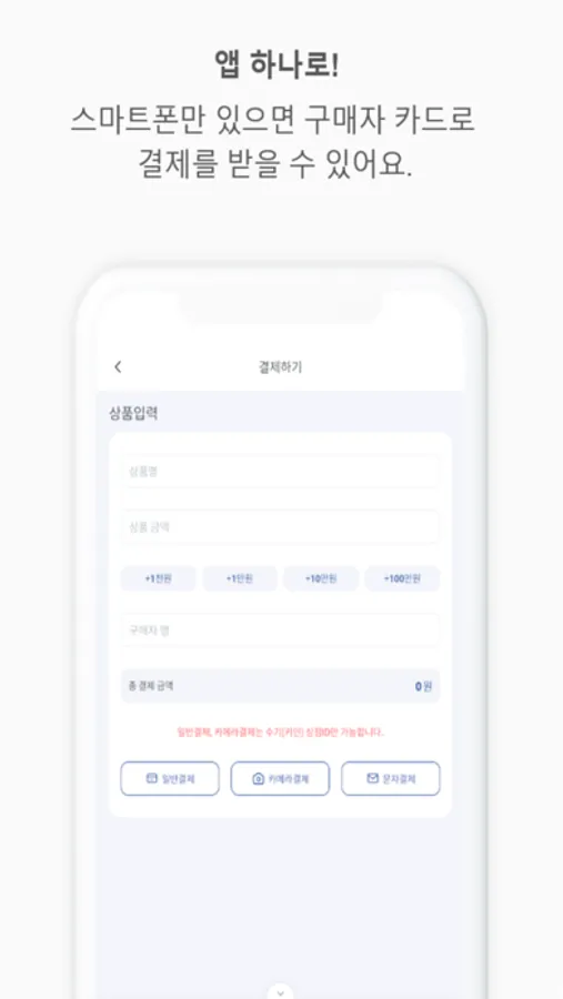 스마트폰 하나로 시간과 장소의 제약 없이 쉽고 안전하게 상품을 팔고 결제를 받을 수 있습니다.