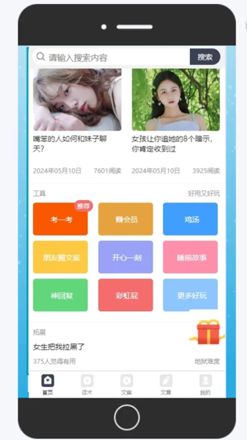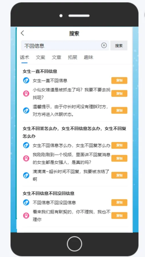 4、众多工具:比如神回复,睡前故事,彩虹屁等恐内向、形象不佳,不知道如何去结交心仪的对象2、不知道破冰技巧,在聊天时就陷入被动,对方对你爱答不理3、瞎聊,浪费时间,跟ta交往很久,但不会推进关系4、明明相爱的两个人,却相处总是很艰难5、恋爱中不会哄对象【产品功能】1000w+恋爱话术轻松一搜,只需复制黏贴,就能把你喜欢的人聊的小鹿乱撞5000+恋爱教程,手把手教你怎么追到ta,学习正确的聊天思维,让你少走恋爱弯路。海量风趣土味情话,好玩的情话梗,情话宝典,恋爱密语,巧妙解决尬聊话题