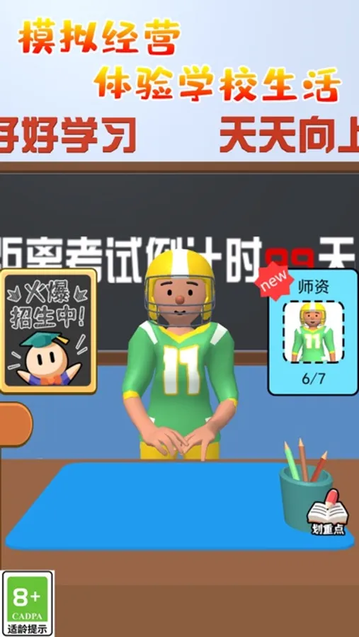 这是一款3D卡通风格的角色扮演游戏,玩家在游戏中会成为一名人民教师,你需要每天按时完成教学任务,为了学生的全身心健康发展,课余时间还要准备一些有益身心健康的活动。第一视角设计,包括批阅作业、上课还有跟学生谈话等等,都有一种身临其境的感觉。如果你曾经也有过一个教师梦,那么就来下载学霸在哪里体验一下吧~