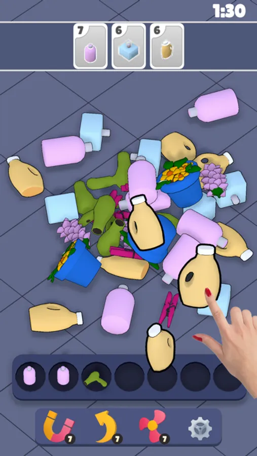 * Keep sorting and matching objects until you clear all tiles from the screen