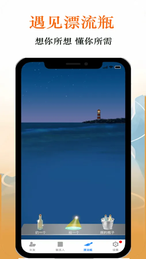 在【漂流瓶】中宣泄自己的情绪,让大海带走你的哀愁,或者捞取自己喜欢的瓶子,即刻开聊。