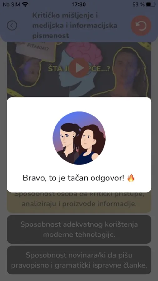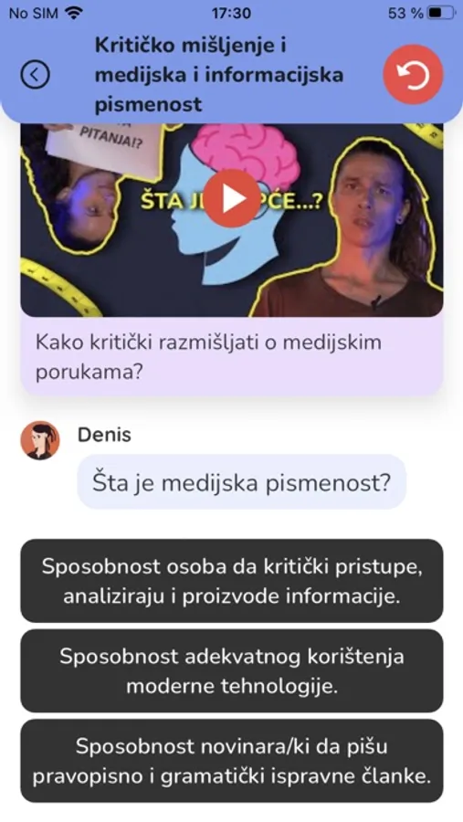 The content of the application is divided into seven thematic modules. The interactive modules are designed to cover different critical thinking and media literacy segments. They consist of videos, textual explanations, pictures and questions for users.