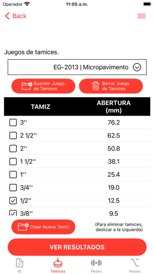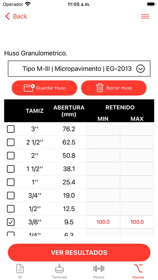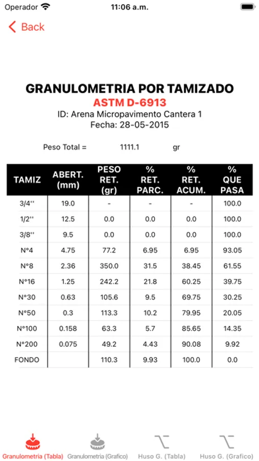 Presenta una tabla con los pesos retenidos, % retenidos parciales, % retenidos acumulados y % que pasa para cada tamiz.