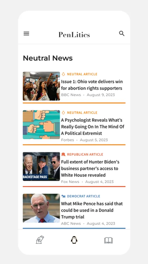 PenLitics is a political education app that teaches you the importance of politics, voting, and political bias in the news.