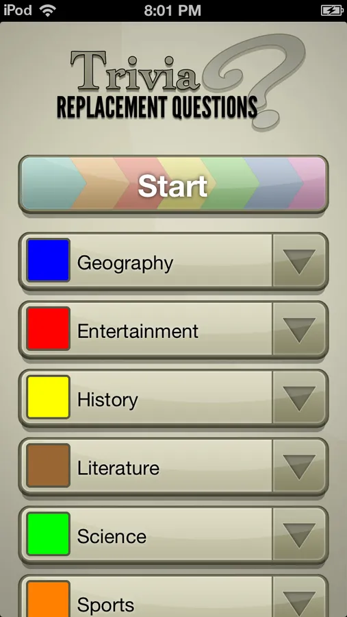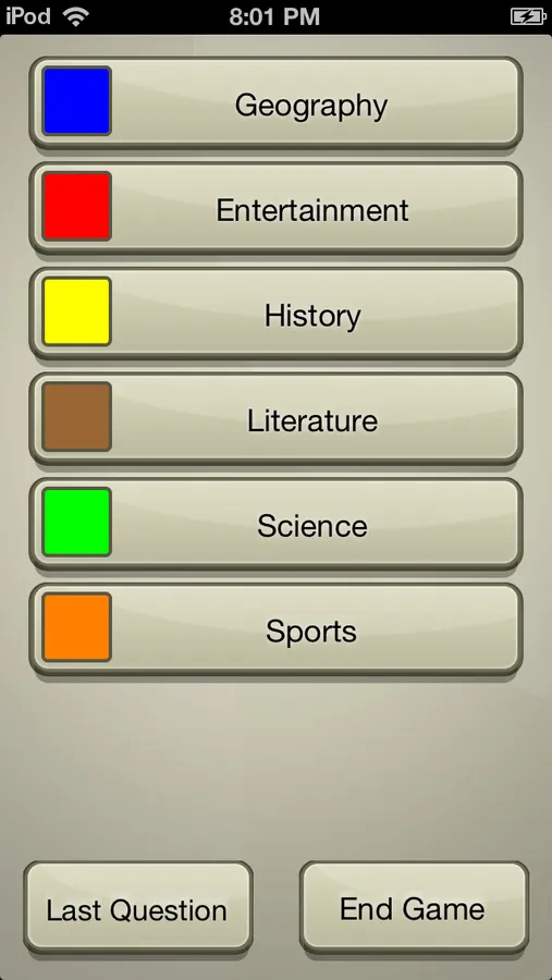 Pick any 6 categories and choose a color for each (16 colors in total) then start the game! This app effectively replaces the questions cards you would normally use with your board game.