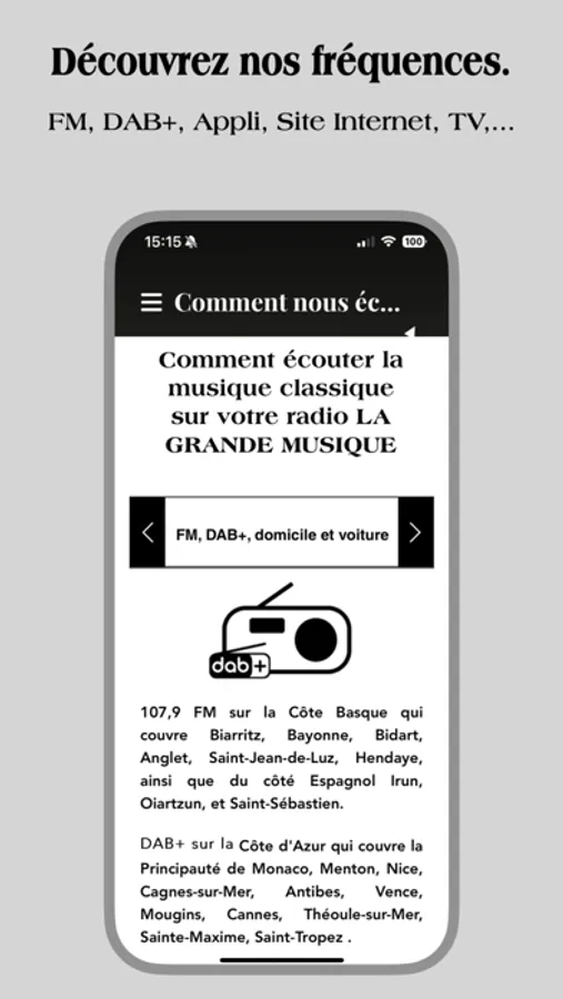 - Écouter le direct où que vous soyez, avec un flux haute qualité sur iPhone et iPad.
