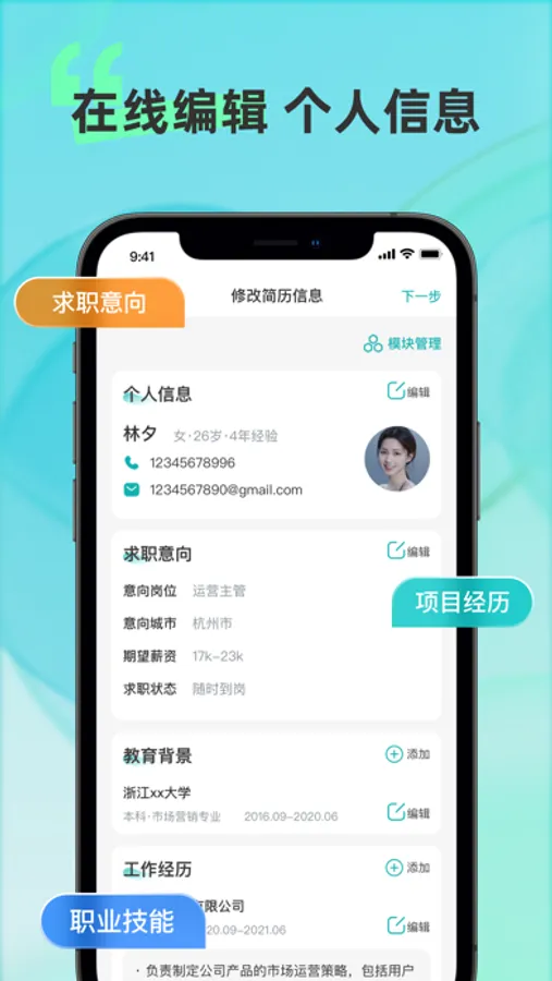 个人简历制作,求职人都在用的简历制作神器!无论您是在找实习、兼职小工、投递社招还是申请校招,一份让 HR 眼前一亮的简历至关重要!个人简历制作提供专业的简历模板设计,让您的简历在众多求职者中脱颖而出。更有各行各业的特色简历风格任您挑选,提高求职成功率,offer 拿不停!