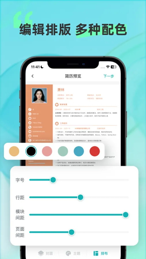 任意调整简历主题颜色、字体大小、行间距、封面等来进行个性化处理,让您的简历在HR面前脱颖而出,提升求职成功率。