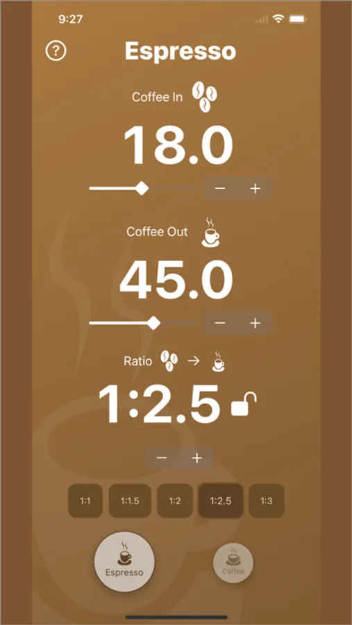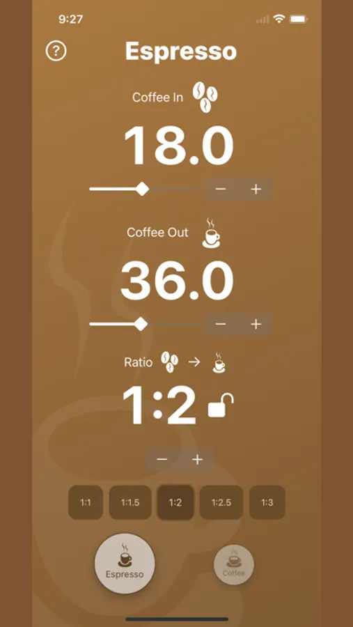 On Espresso mode: Enter the amount of coffee for your shot, then you have two options, if you know how many coffee you want out enter that value and the all will tell you the ratio for that setting, and if you know the ratio you want, then set that one in the app and it will tell you the coffee you'll be getting out. so you'll know when to stop the machine. There are also five predefined ratios for common recipes.