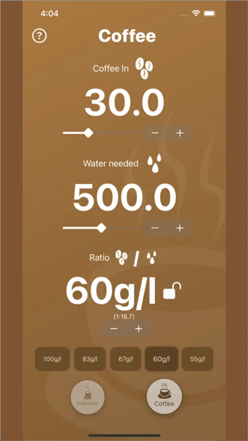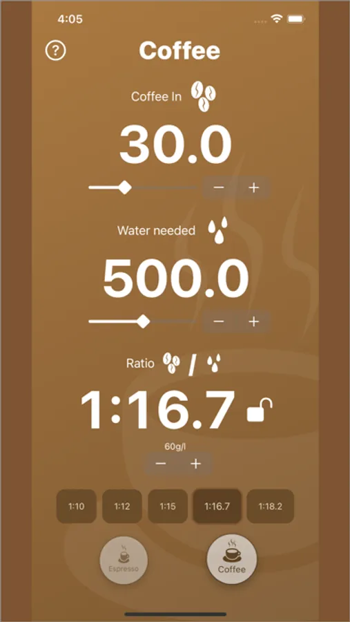 On Coffee Mode. if you know a recipe you can enter its value in the app, or enter the coffee in and use one of the predefined options. this will tell you the amount of water you'll need to pour for that given recipe. Using the lock button will set the ratio for the recipe, editing the coffee in will change the water needed, and editing the water needed will change the coffee in value.