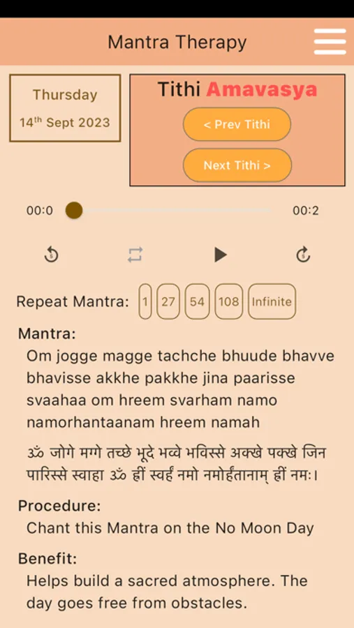 Mantra Meditation: Dive into the world of mantra therapy by listening to powerful mantras. Choose to repeat them once, 27 times, 54 times, or 108 times, or simply let them play infinitely for your meditation practice.